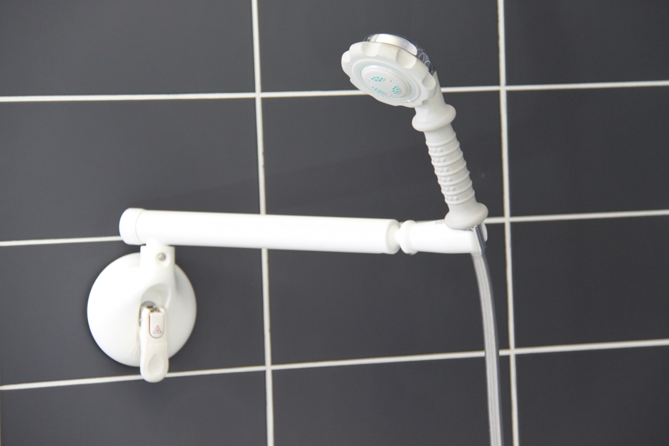 De instelbare douchekophouder met zwenkarm zorgt ervoor dat de douchekop altijd binnen handbereik is, zelfs zittend.