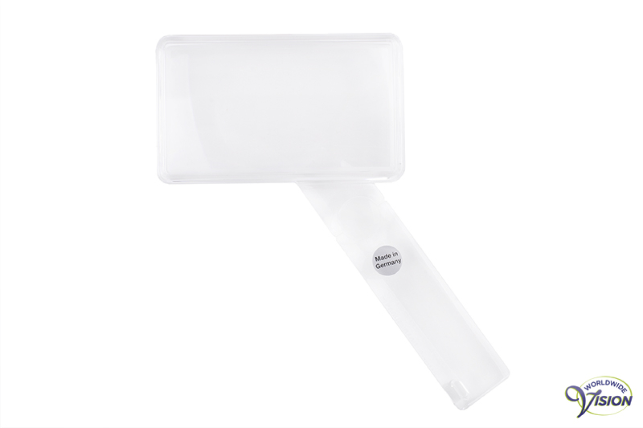 Eschenbach rechthoekige handloep 26129501 met tranparant frame en extra lens in het handvat. Uitstekende oriëntatie op het lezen van materiaal door het transparant frame. Met extra hoge vergroting van de lens in het handvat voor het herkennen van details. Vergroot 1.5 maal en de extra lens in handvat 5 maal. Afmetingen 90 x 50 mm.