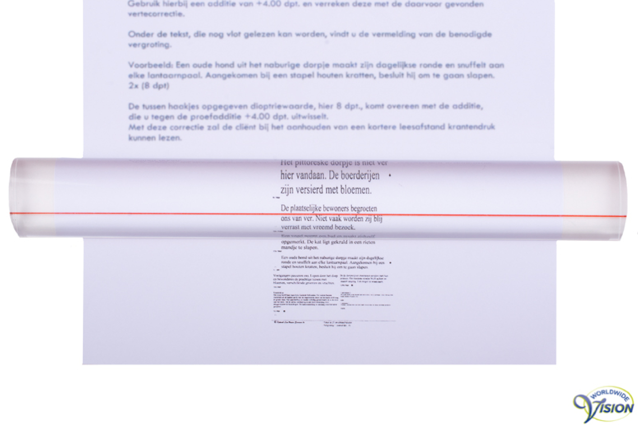 Eschenbach leesliniaal 2608, 25 x 3.5 cm, vergroot 1.8 maal, met rode geleidelijn.