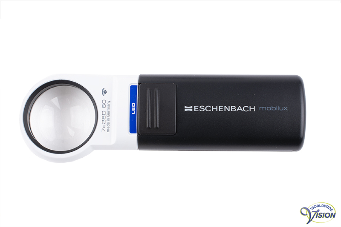 De Eschenbach Mobilux LED 15117 28D is een compacte ronde handlichtloep, geschikt voor het lezen van kleine letters, bijvoorbeeld in een telefoonboek of op prijskaartjes. Voorzien van een asferische PXM krasvaste en lichtgewicht lens, gecoat voor een vervormingsvrij beeld. De LED-verlichting heeft een lange levensduur en er is keuze uit 3 verschillende lichtkleuren door de meegeleverde kleurenfilters. Eenvoudig te gebruiken dankzij de grote, eenvoudig te bedienen lichtschakelaar. Door het handige oogje aan het uiteinde van het handvat kunt u een draagkoord halen om de loep gemakkelijk mee te nemen.