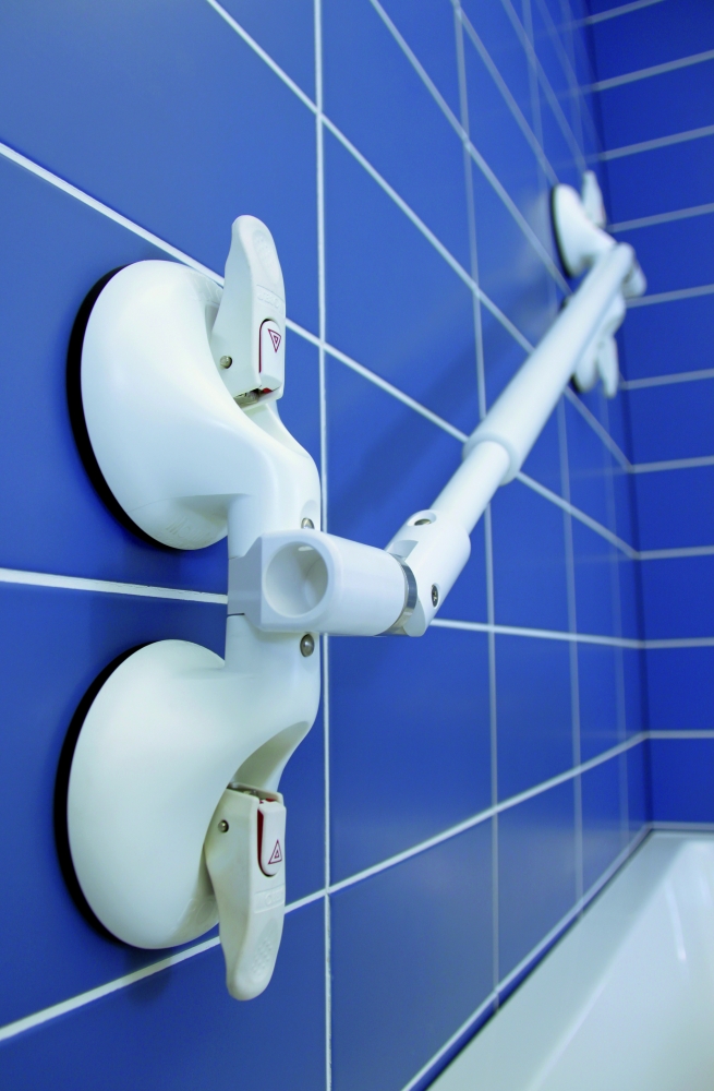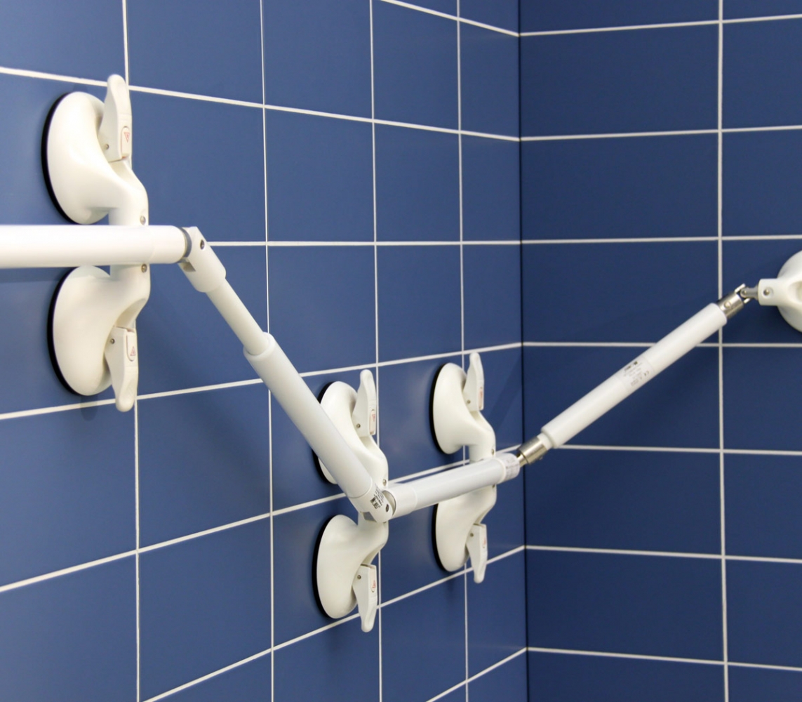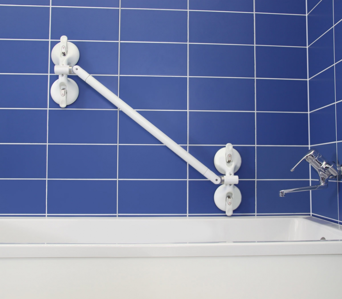 Het toepassingsgebied van alle mobiele verstelbare beugels kunt u eenvoudig uitbreiden, wanneer de scharnieren tussen de zuignap en grijpstang worden ingevoegd. Daardoor zijn de meest uiteenlopende hoeken bereikbaar en wordt er een maximum aan flexibiliteit bij het positioneren gerealiseerd. Bijvoorbeeld een beugel aan de binnenkant van het bad.