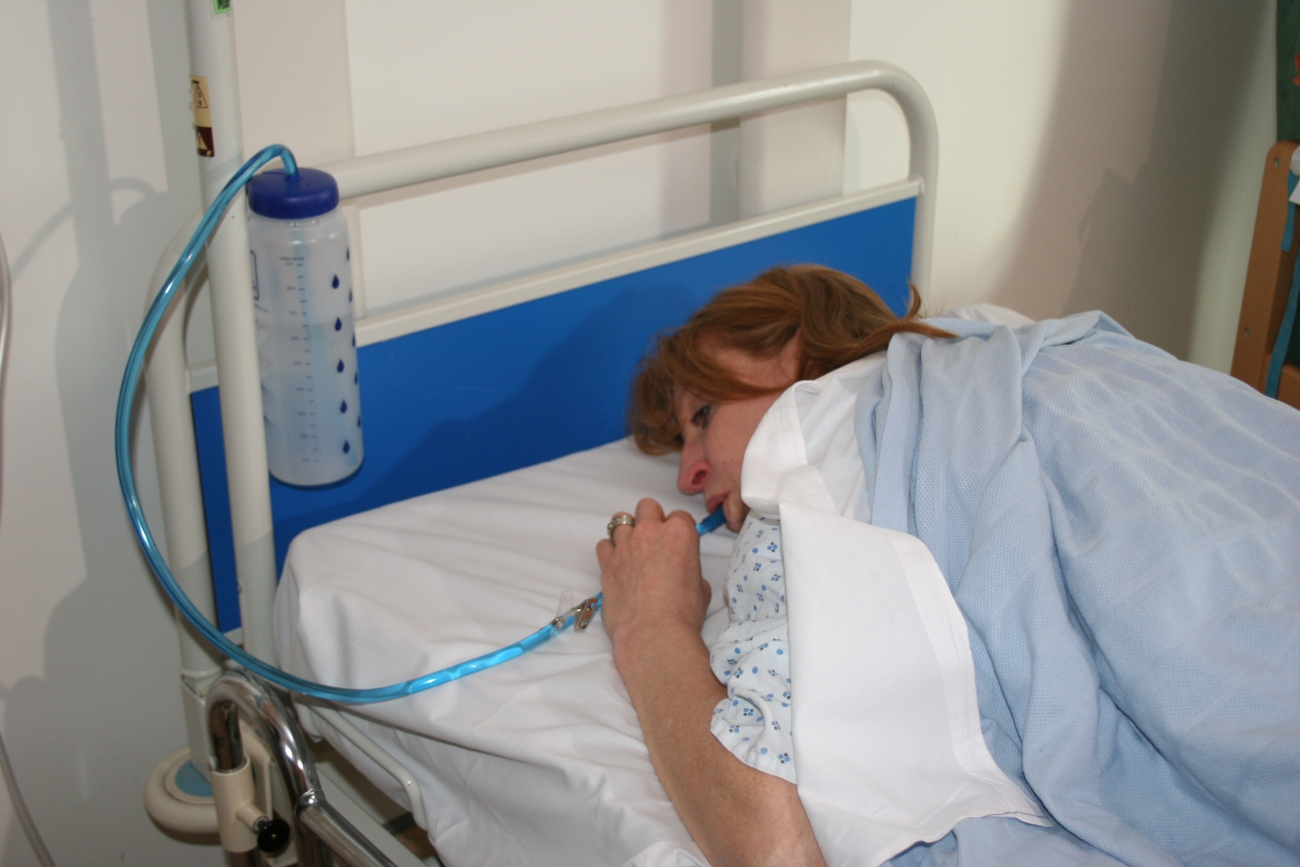 Vul de fles met vloeistof en hang de fles aan een bed, rolstoel of stoel.
