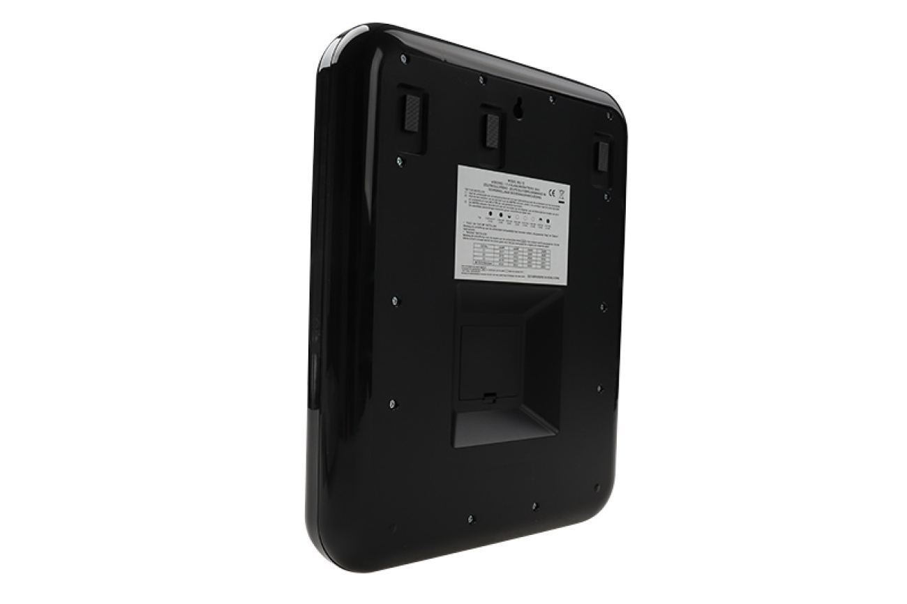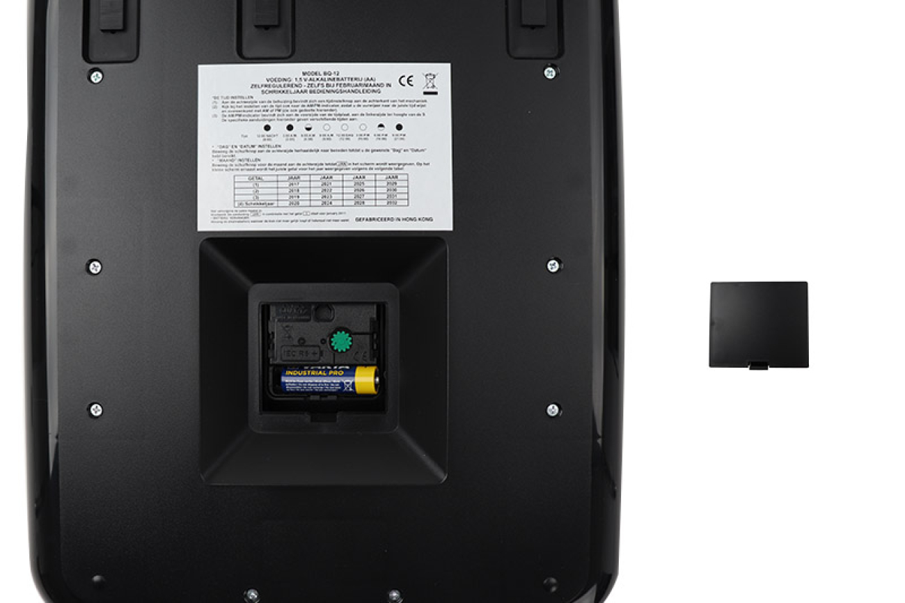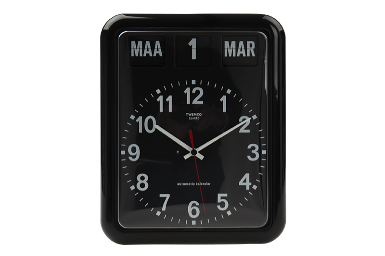 Grote Twemco kalenderklok voor slechtzienden. Dit wandmodel heeft een grote, zwarte, analoge wijzerplaat met witte wijzers en 12 witte cijfers van 3 cm hoog. De kalenderaanduiding (dag, datum en maand) heeft witte, digitale valletters van 2,5 cm hoog op een zwarte achtergrond. Nederlandse taal.