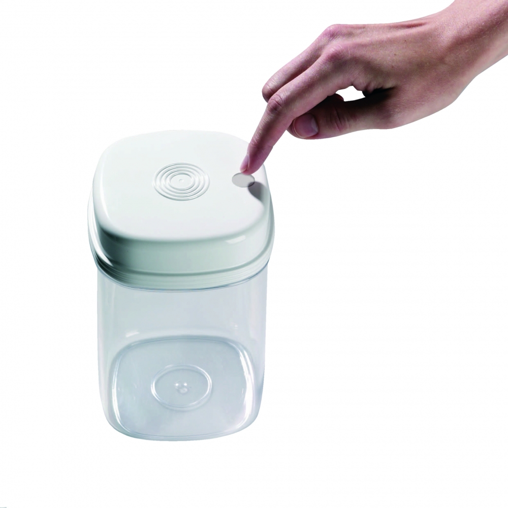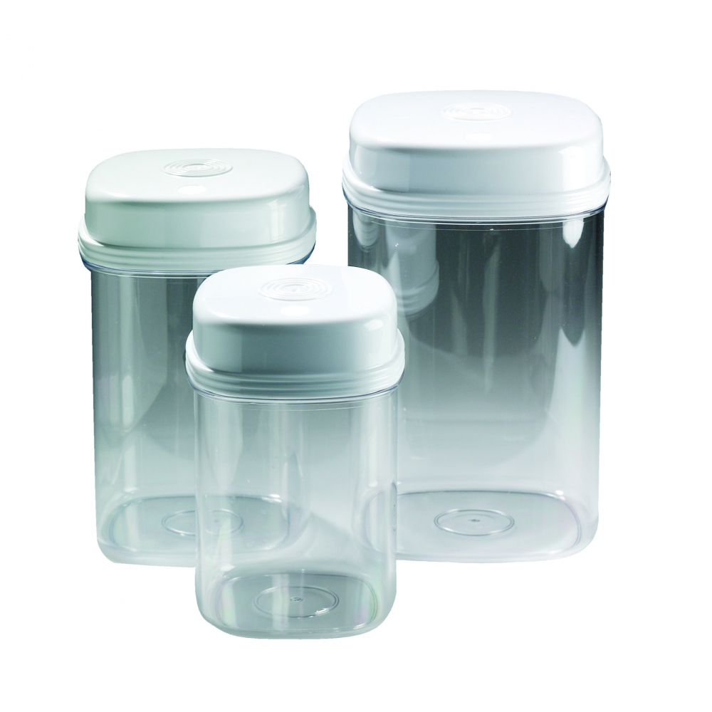 Set van 3 keukenboxen. Eenvoudig en snel te openen. Druk op de geribbelde knop op de rand en de box is open. Druk op het midden van het deksel om de box weer te sluiten. Ideaal voor personen met weinig tot geen kracht in de handen.