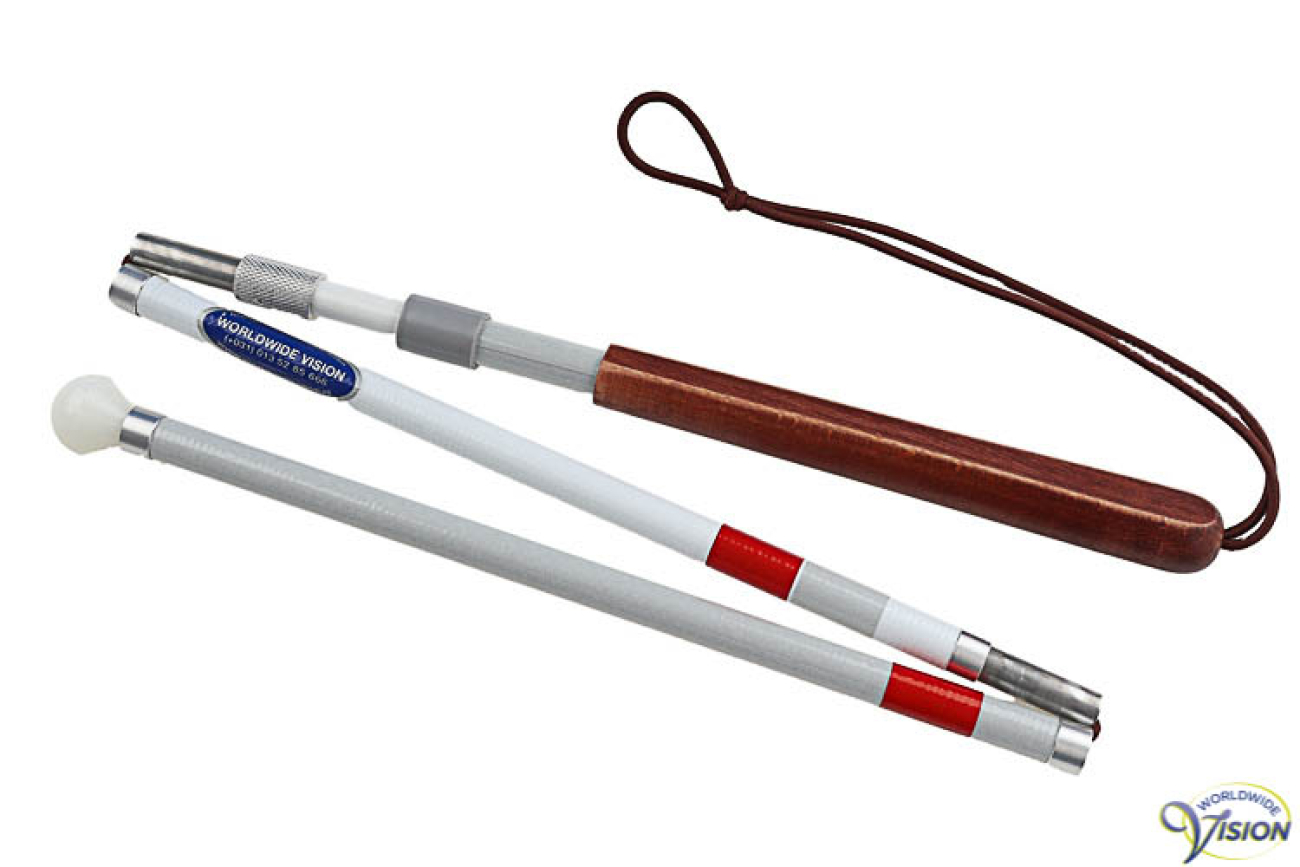 Afgeplat beukenhouten handvat met draaiklemmechanisme. Opvouwbaar in drie delen en gedeeltelijk telescopisch uitschuifbaar. Inclusief opbergetui.