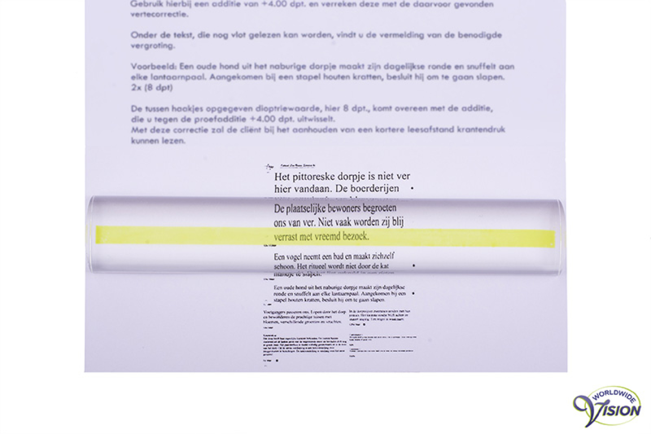 Leesliniaal, 15 x 2.5 cm, vergroot 1.5 maal met gele markeringslijn.