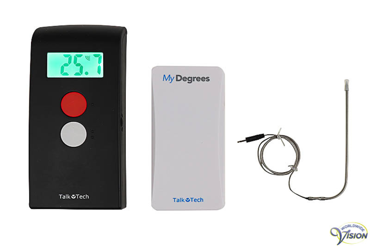 Multifunctionele thermometer MyDegrees, draadloze, 10-talig waaronder Nederlands, Engels, Duits, Frans, Italiaans en Spaans sprekend multimeter voor binnen en buiten met losse meetsonde voor koken, bakken, braden, vloeistoffen, koelkast en diepvriezer, meetbereik van -29° tot 240°C., display binnenmeter met zwarte cijfers van 15 mm hoog op groene achtergrond, instelbaar alarm dat de 5 laatste temperaturen uitspreekt totdat de ingestelde temperatuur is bereikt, volumeregeling, afmetingen binnenmeter 130 x 60 x 15 mm kleur zwart en buitenmeter 100 x 50 x 15 mm kleur wit, ophangmogelijkheid binnenmeter met magneet, schroef of klittenband en buitenmeter met schroef of klittenband, incl. meetsonde, klittenbandjes en 6 AAA batterijen.{Specificaties:Belangrijke kenmerken:- talen: Nederlands, Engels, Duits, Frans, Italiaans, Spaans, Zweeds, Noors, Deens en FinsFysieke specificaties:- Materiaal: behuizing buiten- en binnenmeter kunststof, meetsonde aluminium- Kleur binnenmeter zwart, buitenmeter wit- EANcode:Voeding:- Buitenmeter 4.5 V / 3 x 1.5 V AAA batterij – Binnenmeter 4.5 V / 3 x 1.5 V AAA batterij- Garantietermijn: 1 jaarStandaard meegeleverd:- MyDegrees buitenmeter- MyDegrees buitenmeter- Losse meetsonde- Klittenbandjes- 6 Batterijen type 1.5 V AAA- Handleiding}