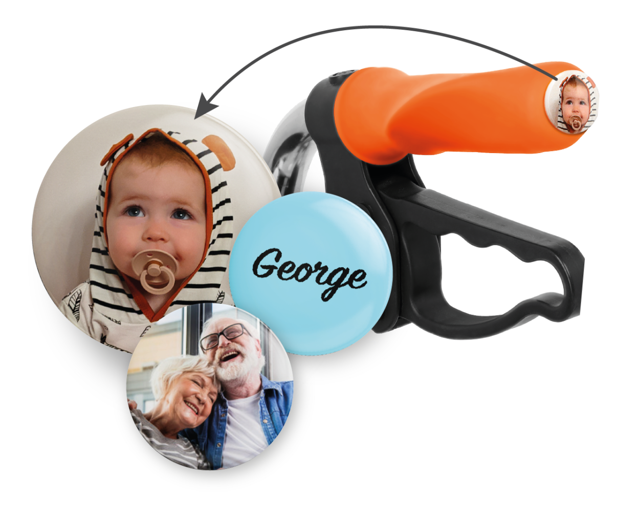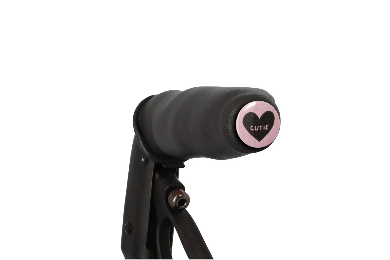 De MyRollerSleeve wordt geleverd met een button die kan worden gepersonaliseerd met een foto, naam of logo. Zo is de rollator herkenbaar voor bijvoorbeeld mensen met dementie.