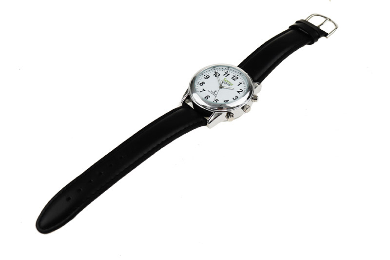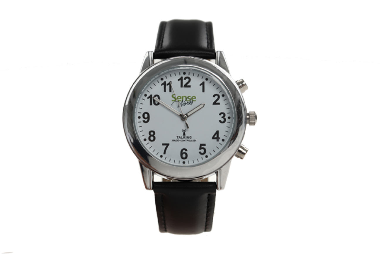 SenseWorks Nederlandssprekend horloge gemaakt van metaal met een witte analoge wijzerplaat met witte fluoriserende wijzers en 12 zwarte cijfers. Met keuze voor tijd- en alarmuitspraak in 12 of 24 uursklok, bijvoorbeeld: “De tijd is vijf over twaalf in de middag”. Inclusief mogelijk tot het instellen van een alarm. Functies zoals tijd, alarm, dag en datum worden met zeer professionele stem geheel uitgesproken.