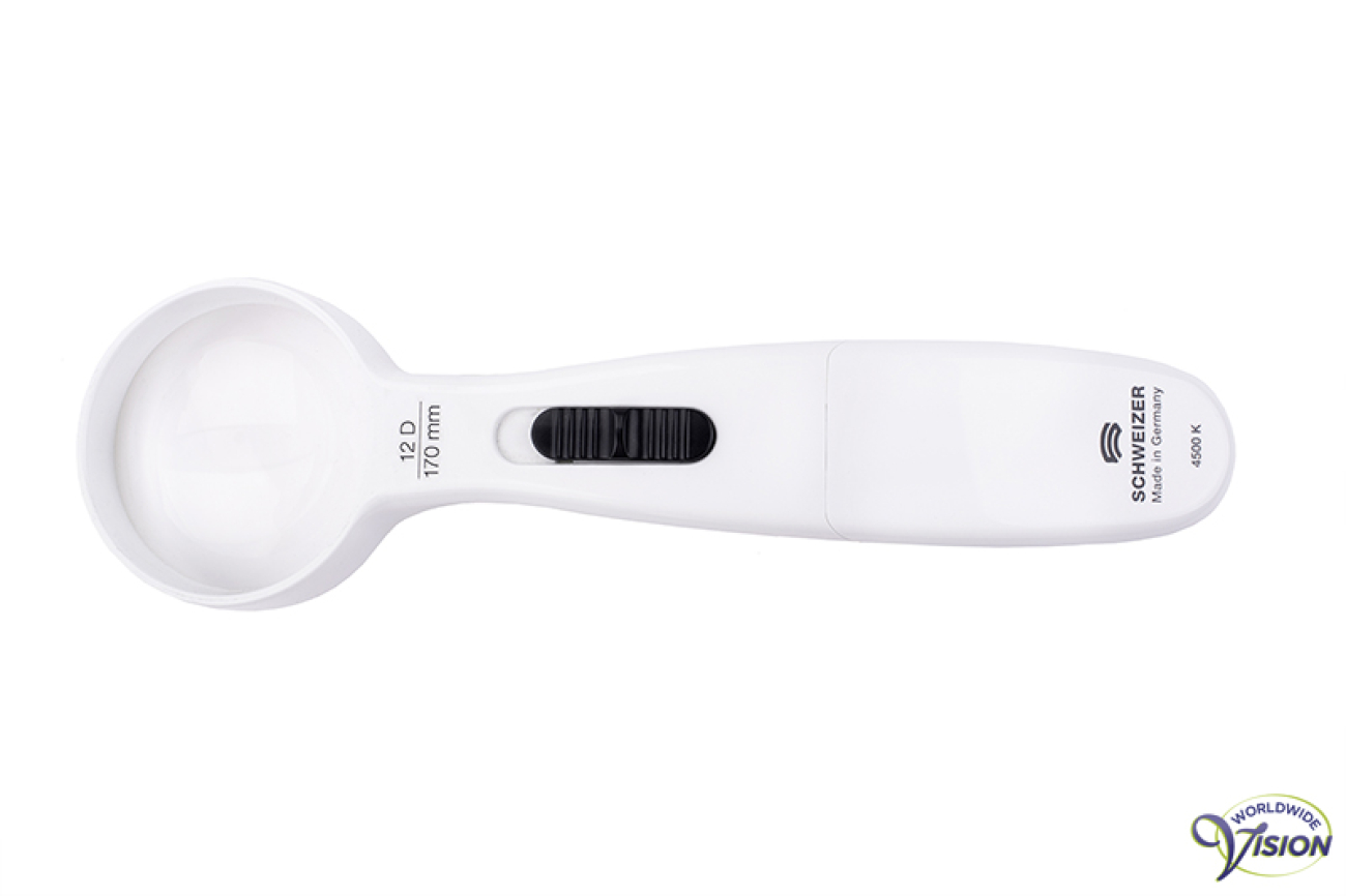 Schweizer ERGO-Lux MP LED 171122 12D ergonomische, lichtgewicht handloep en optioneel standloep met SMD LED-verlichting van 4500 K en twee lichtintensiteiten, asferische lens van 70 mm, vergroot 3 maal, kleur wit/donkergrijs, excl. 3 AAA batterijen. Optioneel magnetische standaard om als standloep te gebruiken.