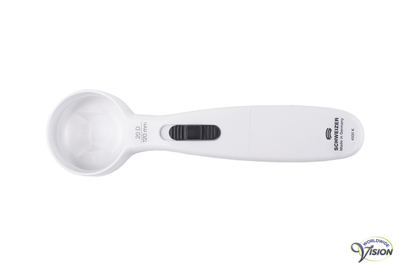 Schweizer ERGO-Lux MP LED 171202 20D ergonomische, lichtgewicht handloep en optioneel standloep met SMD LED-verlichting van 4500 K en twee lichtintensiteiten, asferische lens van 55 mm, vergroot 5 maal, kleur wit/donkergrijs, excl. 3 AAA batterijen. Optioneel magnetische standaard om als standloep te gebruiken.