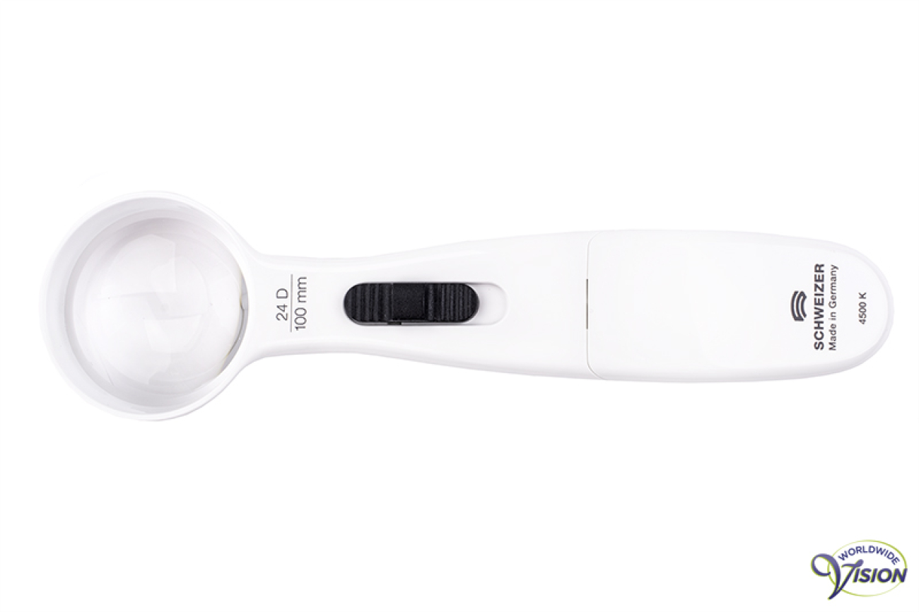Schweizer ERGO-Lux MP LED 171242 24D ergonomische, lichtgewicht handloep en optioneel standloep met SMD LED-verlichting van 4500 K en twee lichtintensiteiten, asferische lens van 55 mm, vergroot 6 maal, kleur wit/donkergrijs, excl. 3 AAA batterijen. Optioneel magnetische standaard om als standloep te gebruiken.