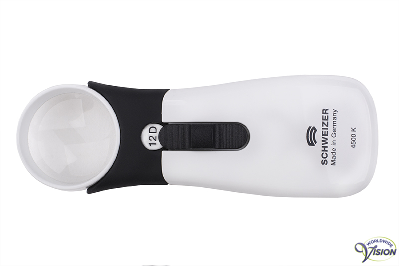 Schweizer ERGO-Lux MP Mobile LED 164132 12D draagbare lifestyle handlichtloep met SMD LED-verlichting van 4500 K en twee lichtintensiteiten, asferische lens van 35 mm, vergroot 3 maal, kleur wit/donkergrijs, incl. bescherm-/schoonmaakhoesje, excl. 3 AAA batterijen.