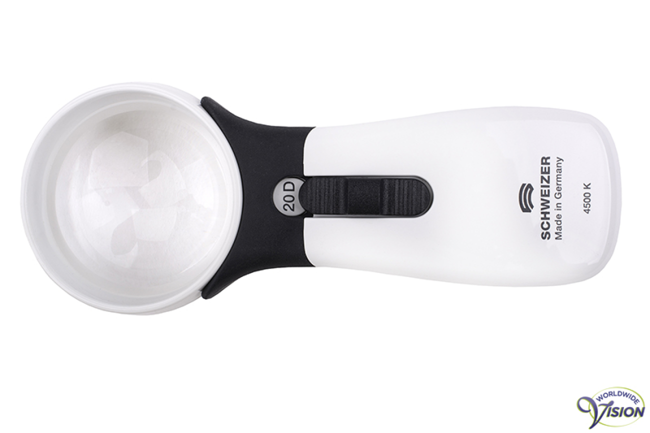 Schweizer ERGO-Lux MP Mobile LED 164202 20D draagbare lifestyle handlichtloep met SMD LED-verlichting van 4500 K en twee lichtintensiteiten, asferische lens van 55 mm, vergroot 5 maal, kleur wit/donkergrijs, incl. bescherm-/schoonmaakhoesje, excl. 3 AAA batterijen.