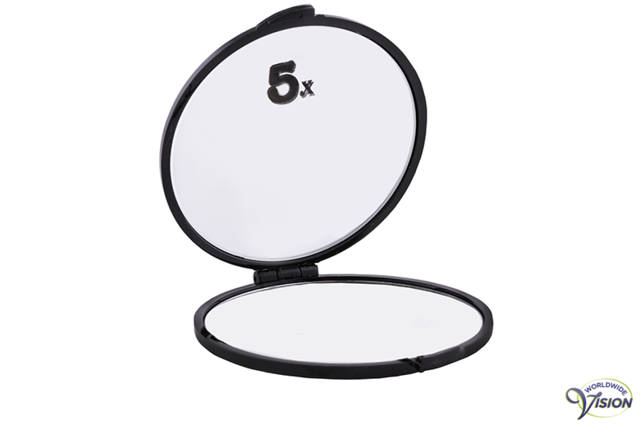 Make-up spiegeltje van kunststof, dubbelzijdig poederdoosmodel, diameter 7.5 cm, vergroot 5 maal en normaal.
