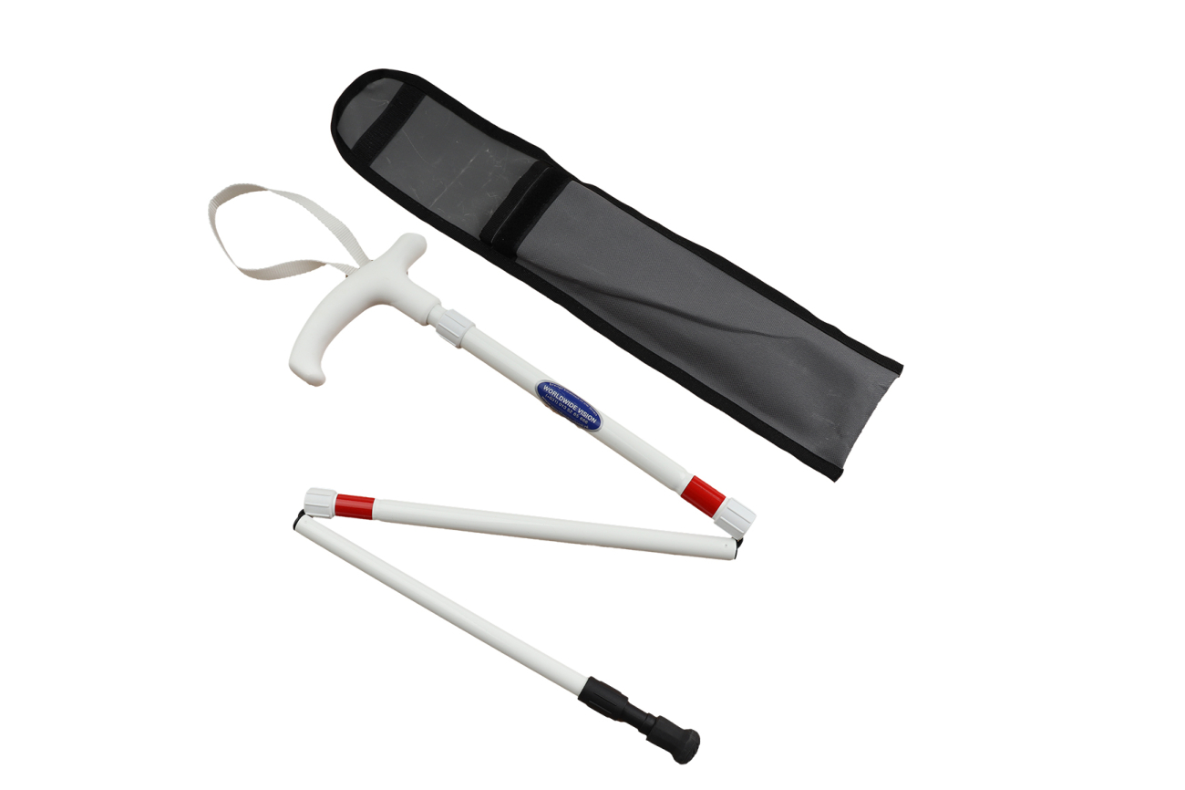 De steunstok is gemaakt van aluminium, opvouwbaar in drie delen. Kleur wit en voorzien van 2 rode reflectiebandjes. T-vormige handgreep. Inclusief polsbandje en hoes. Door de sterke constructie en de afneembare rubberdop ook te gebruiken in sneeuw en bergen.