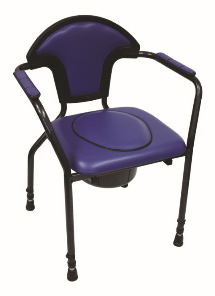 Een stijlvolle en comfortabele toiletstoel. De stoel is ruim en comfortabel. Deze toiletstoel heeft een waterafstotende zachte bekleding, een gecoat metalen frame, een ergonomische rugleuning en twee sterke armleuningen voor een goede ondersteuning. De zachte zitting biedt comfort tijdens het zitten en kan geheel verwijderd worden. De ruimte tussen de armleuningen is extra breed. De toiletemmer is van bovenaf uitneembaar. Wanneer u de stoel niet gebruikt, plaatst u het losse deksel op de stoel. Wordt geleverd met toiletemmer met deksel.