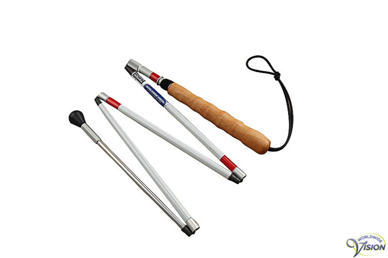 Ultraflex taststok gemaakt van aluminium met peervormige kunststof punt van 25 mm. Voorzien van witte en rode reflectie bandjes. Konische verbindingspennen en afgeplat beukenhouten handvat met draaiklemmechanisme. Opvouwbaar in vijf delen en gedeeltelijk telescopisch uitschuifbaar.