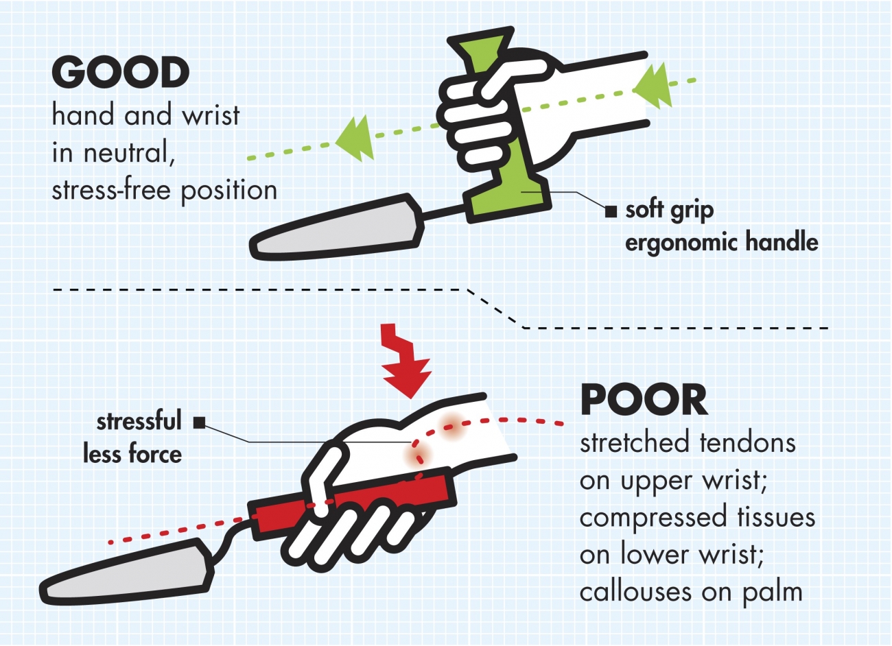 Het gehoekte handvat is dikker gemaakt voor een comfortabele grip. Tevens voozien van een zachte anti-slip. Het mes is voorzien van nieuwe frisse kleuren. Het zachte antislip materiaal is gemarkeerd met een felgroene kleur. De hoek van het handvat is 90° en houdt hand en pols in een natuurlijke positie. Lichtgewicht en het mes is gemaakt van roestvrij staal.