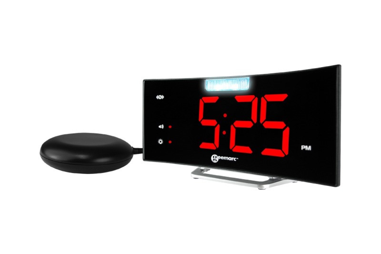 Dit product – Wake ’n Shake Curve Alarm Clock (): Wekker met een groot gebogen LED-scherm (11 x 5 cm) met rode cijfers op een zwarte achtergrond. Met een lichtsignaal, het extra luide volume (90 dB) en het trilkussen dat onder een kussen te plaatsen is, bent u altijd op tijd wakker. Deze functies kunnen gecombineerd worden. Geschikt voor slechthorenden en slechtzienden. Perfect voor dagelijks gebruik of tijdens het sporten. Bestel nu eenvoudig online!