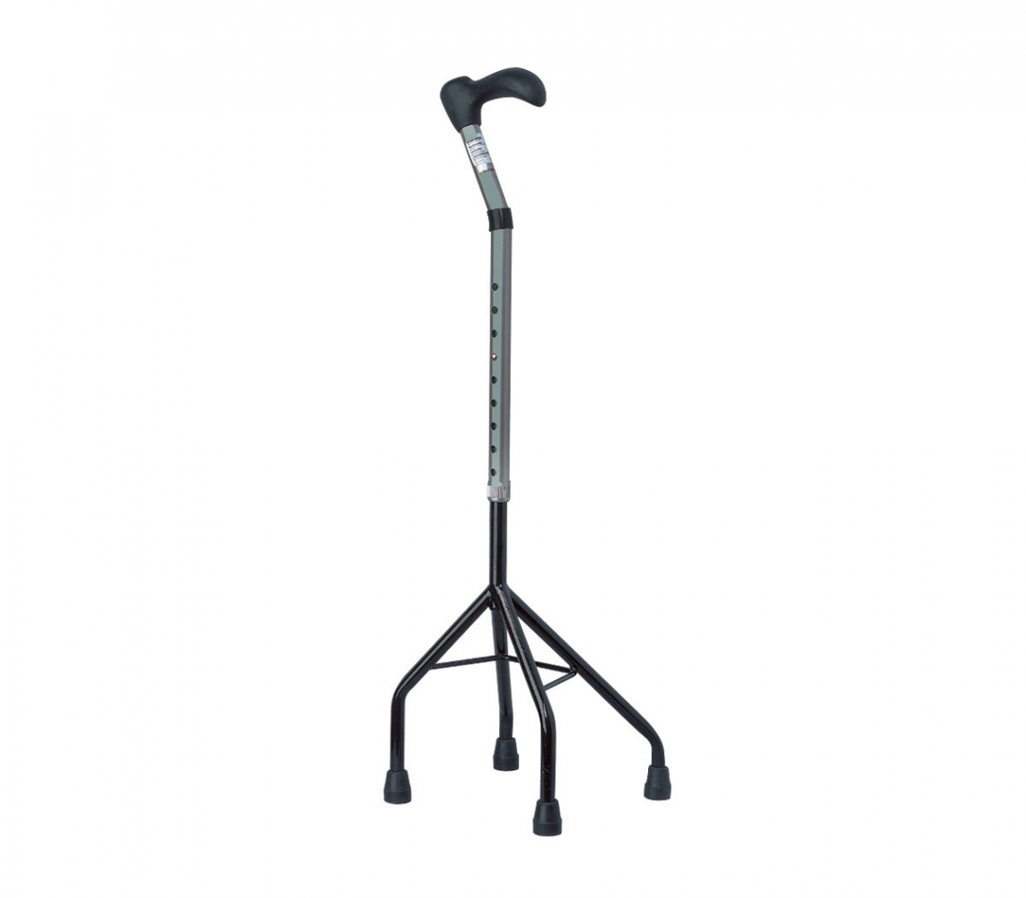 Stalen vierpoot wandelstok met een gebogen bovendeel waardoor het gewicht van de gebruiker direct boven de steel zit voor meer veiligheid. Voorgevormd handvat. De stok kan eenvoudig worden omgedraaid voor links- of rechtshandig gebruik.