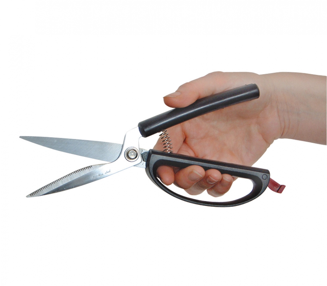 Deze multifunctionele keukenschaar is gemakkelijk in gebruik. Knippen, vervolgens de hand ontspannen zodat de grip open gaat voor de volgende knipbeweging. De schaar wordt niet alleen met de vingers bediend, maar met de hele hand.